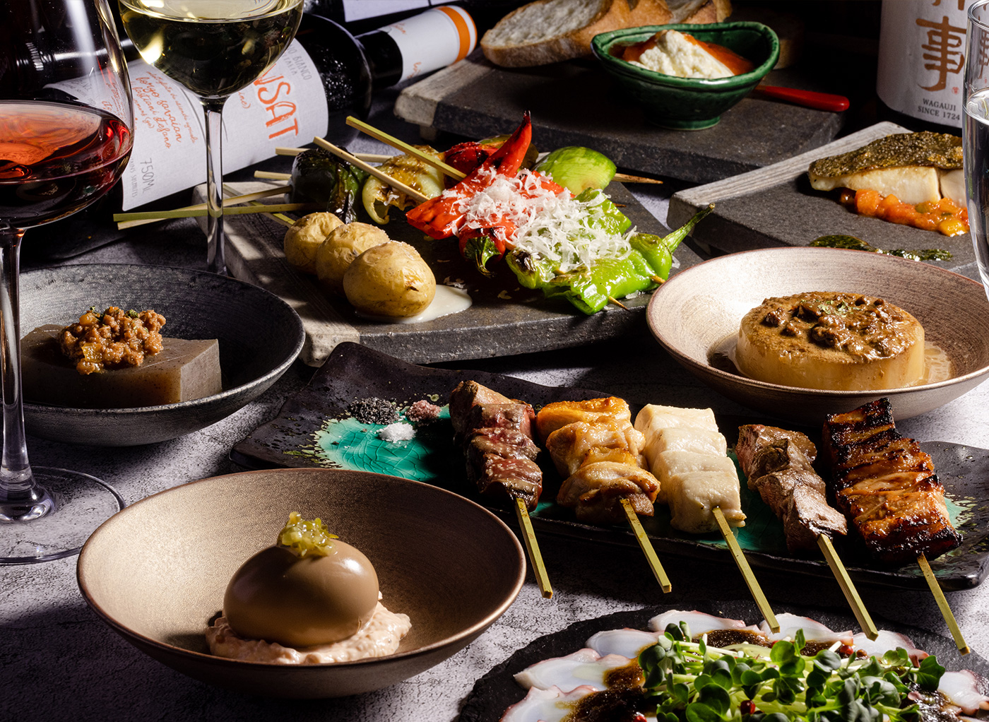 和魂洋才をコンセプトにした、焼き鳥とワイン、ビストロおでんをお楽しみいただけます。