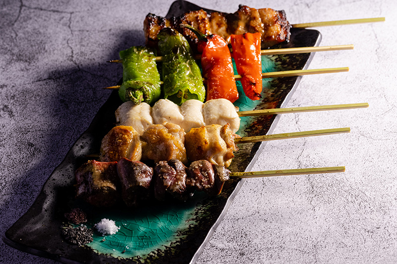 鳥串から3本、豚串・野菜串から1本ずつ、焼き上がった串からお持ちいたします。